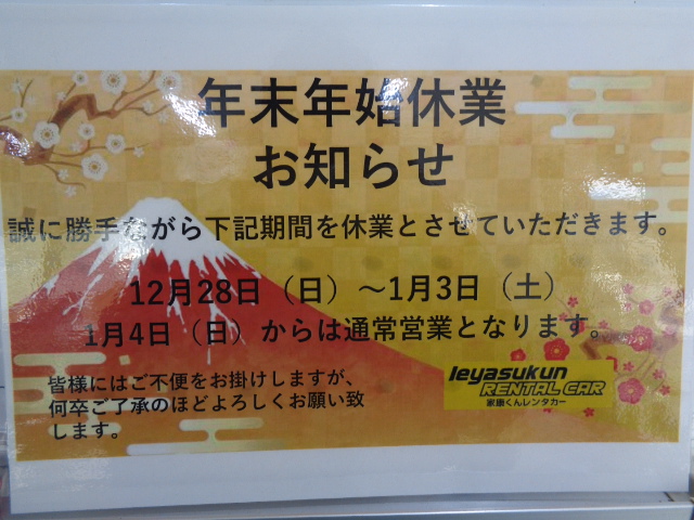年末年始のお休みについて | お知らせ・キャンペーン情報 / 家康くんレンタカー